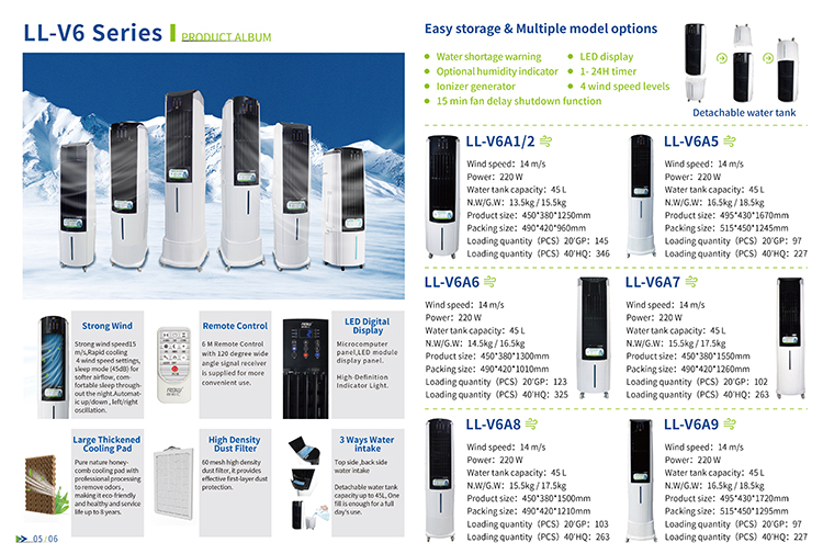 These are V6 series, fashionable outlook, double air outlet, 14m/s air speed, 220W power, 45L large water tank. We designed 6 models and have different height selection, which is from 1.2m-1.7m, separated design to save lots of space in container.