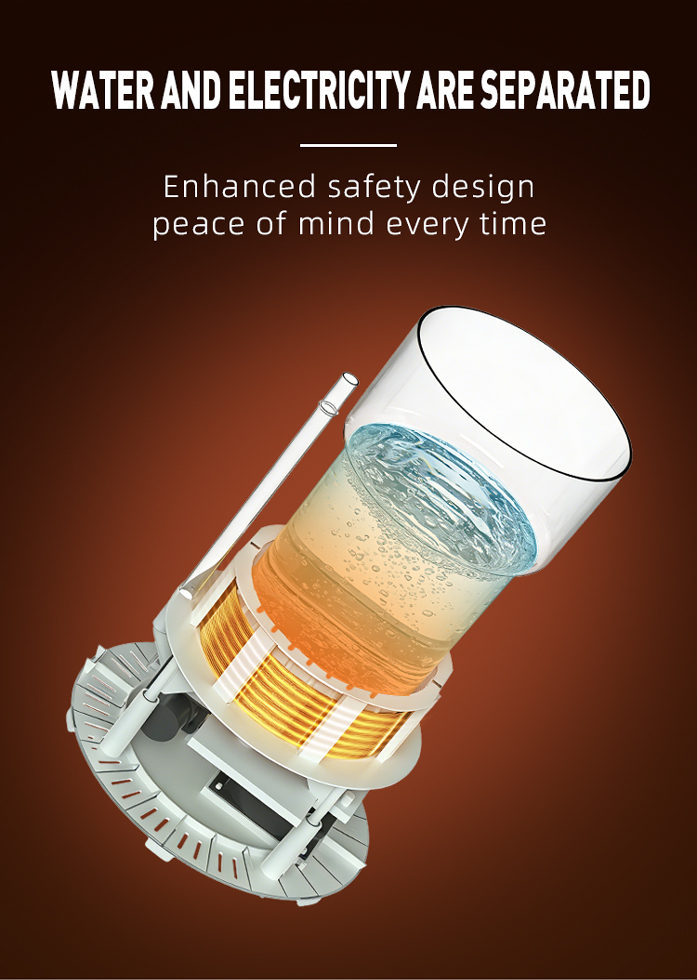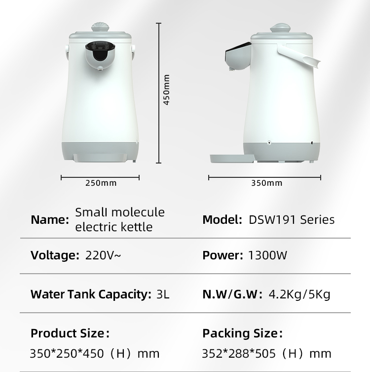 Featuring an eye-catching two-tone design, this small molecule cluster electric kettle effortlessly complements any home decor style. Equipped with 1300W electromagnetic rapid-heating technology, it quickly converts water into small molecule cluster water for better human body absorption. The extra-large 3L glass water tank easily meets a family’s all-day drinking needs, eliminating frequent refills for convenience and eco-friendliness. Its water-electricity separation design and reliable dry-boil protection ensure safe operation at all times. Constructed from food-grade materials, it safeguards drinking water health from the source for total peace of mind with every sip.