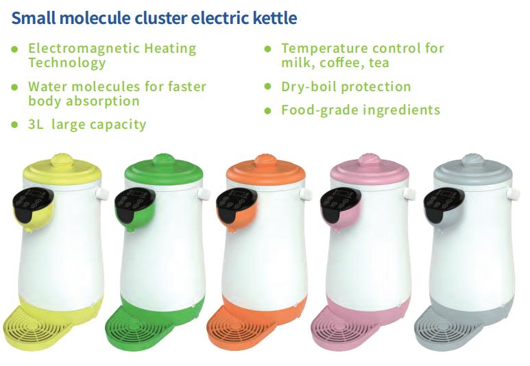 The Small molecule cluster electric kettle which a patented innovation designed to transform ordinary water into micro-clustered molecules for optimal absorption and wellness benefits. Perfect for health-conscious households