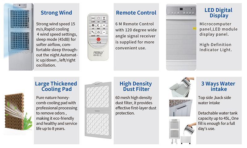 1. Engineered to thrive in high-temperature, dry environments, our cooler combines powerful airflow with efficient water evaporation cooling. The 7000m³/h airflow accelerates moisture evaporation, dropping ambient temperatures by 8-12℃ while maintaining comfortable humidity—no sticky aftermath, just consistent, refreshing coolness.