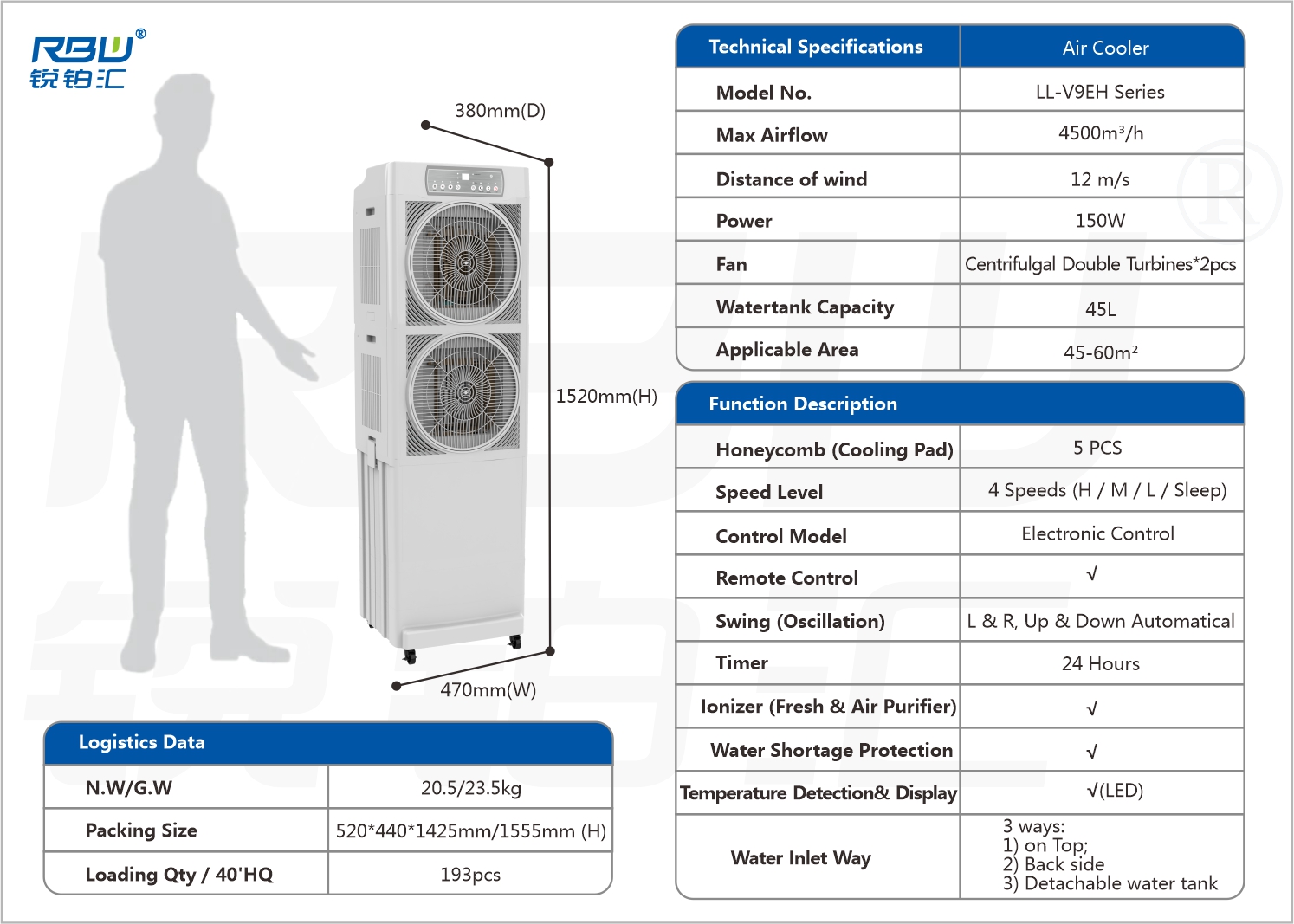 This standing evaporative air cooler is your ideal summer companion. Equipped with dual fans, it delivers powerful wide-angle airflow at 12m/s, quickly cooling your entire room and freeing you from sweltering heat.